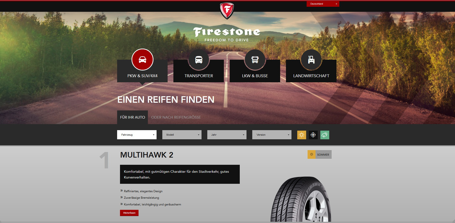 Die neue Firestone Seite kommt in einem lebendigen und jungen Look and Feel daher. Für einen angenehmen Lesekomfort – egal ob auf dem Smartphone, Tablet oder PC – achteten die Entwickler besonders auf Responsive Design und eine geringe Ladezeit. Die Website präsentiert das Firestone Line-up in einem klaren und einfachen Format. Die benutzerfreundliche Produkt- und Händlersuche lässt jeden Autofahrer in kürzester Zeit den geeigneten Reifen und den nächstgelegenen Händler überall in Europa finden.