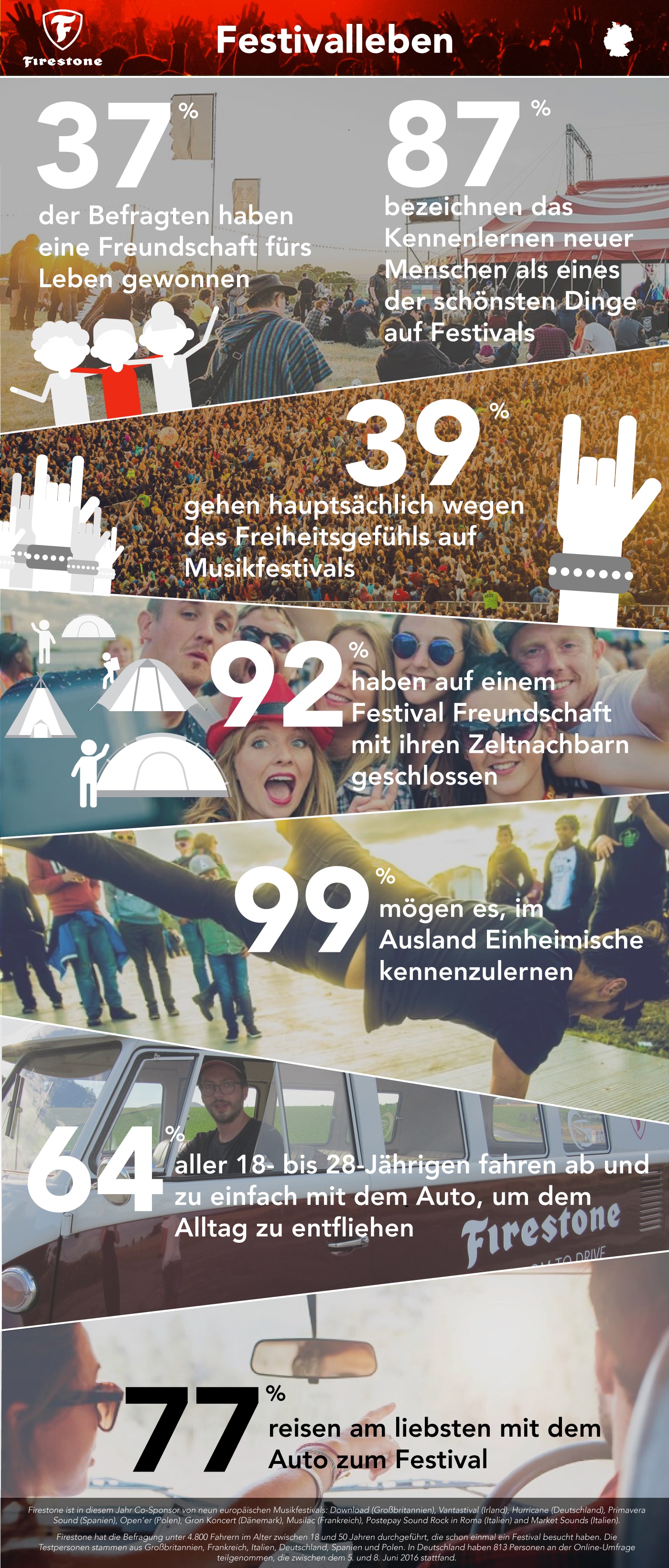 rsuchung von Firestone zeigt einmal mehr, wie die Atmosphäre eines Festivals und ein geteilter Musikgeschmack Menschen zusammenbringen und ein gemeinsames Freiheitsgefühl erzeugen können. Für 87 Prozent aller befragten deutschen Festivalgänger gehört das Kennenlernen neuer Menschen zu den schönsten Aspekten am Festivalbesuch – nahezu ein Drittel gab an, hierdurch eine Freundschaft fürs Leben gewonnen zu haben.