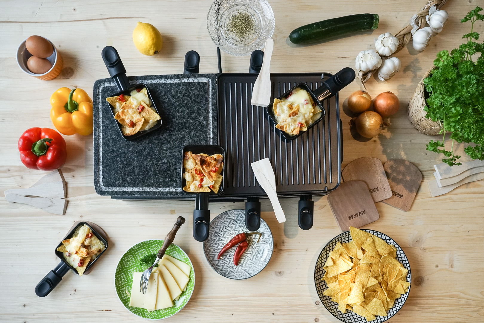 Dass mit den Raclette-Grills von SEVERIN der Grill-Kreativität keine Grenzen gesetzt sind, beweisen zwei einfache aber trotzdem aufregende Rezepte vom Starkoch Jan-Philipp Cleusters: Schwarzwald Raclette und Raclette-Pfännchen mit Tortillachips und feurigen Jalapeños.