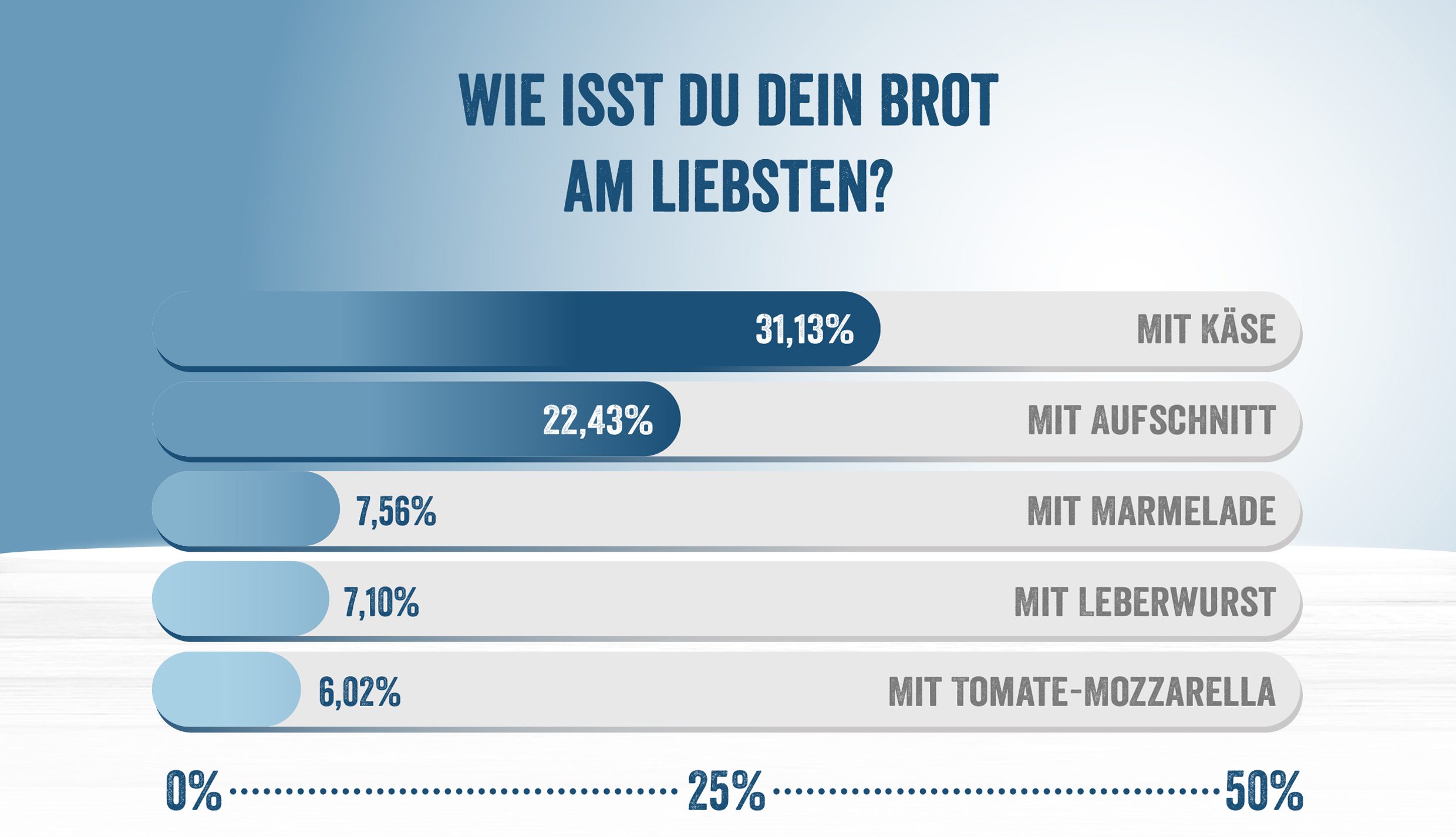 Über 30 Prozent der Befragten haben bei ihrer Brotzeit einen klaren Favoriten: Das Käsebrot ist der unangefochtene Sieger unter den Stullen. Mit 22 Prozent belegt das Butterbrot mit Aufschnitt den zweiten Platz. Beliebt sind somit insbesondere herzhaft-deftige Butterbrot-Varianten. Erst auf dem dritten Platz des Podestes findet sich ein süßer Vertreter: Das Marmeladenbrot kann knapp 8 Prozent der Befragten für sich gewinnen. Trend-Stullen wie das Avocado-Brot können im Ranking nicht glänzen. Nur bei knapp 4 Prozent der Befragten landet das Superfood auf dem Brot.