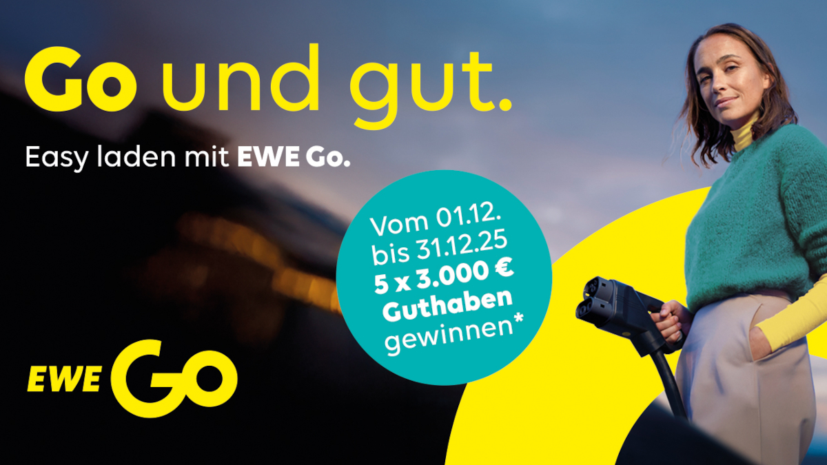 Unter allen E-Autofahrerinnen und E-Autofahrern, die zwischen dem 1. und 31. Dezember 2025 mindestens 1 x mit dem EWE Go-Ladetarif an einer EWE Go-Ladestation laden, verlost EWE Go insgesamt 5 x 3.000 Euro Ladeguthaben. Die Teilnahme am Gewinnspiel unter dem Motto „Go und gut“ erfolgt ganz einfach über ein Formular auf der EWE Go-Website. Wer im Dezember lädt und sich dort registriert, landet im Lostopf. Die fünf Gewinnerinnen und Gewinner werden dann im Januar 2026 ausgelost und im Februar 2026 benachrichtigt.