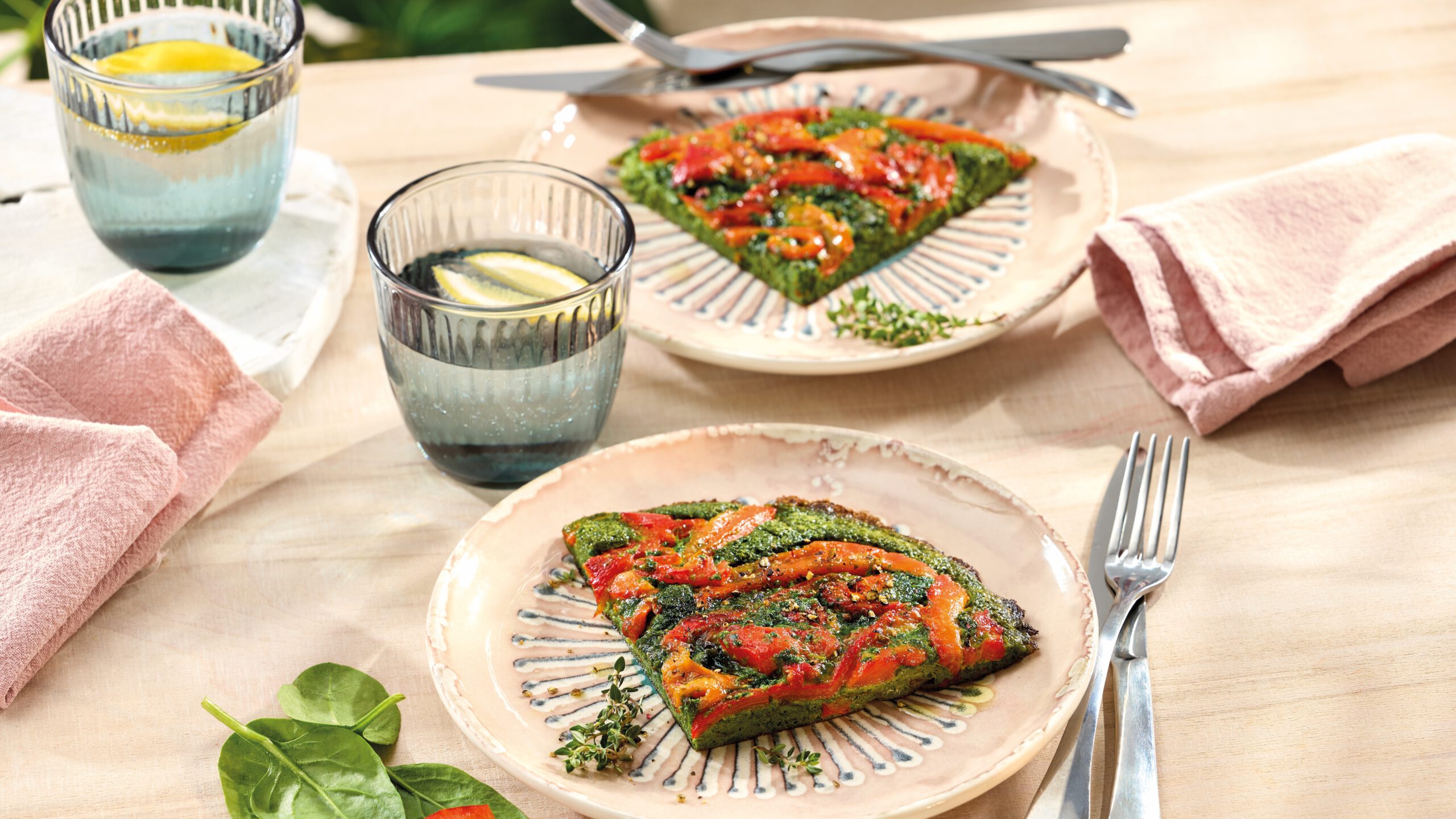 Rezept: Grüne Frittata mit Babyspinat, Bärlauch und gegrillter Paprika