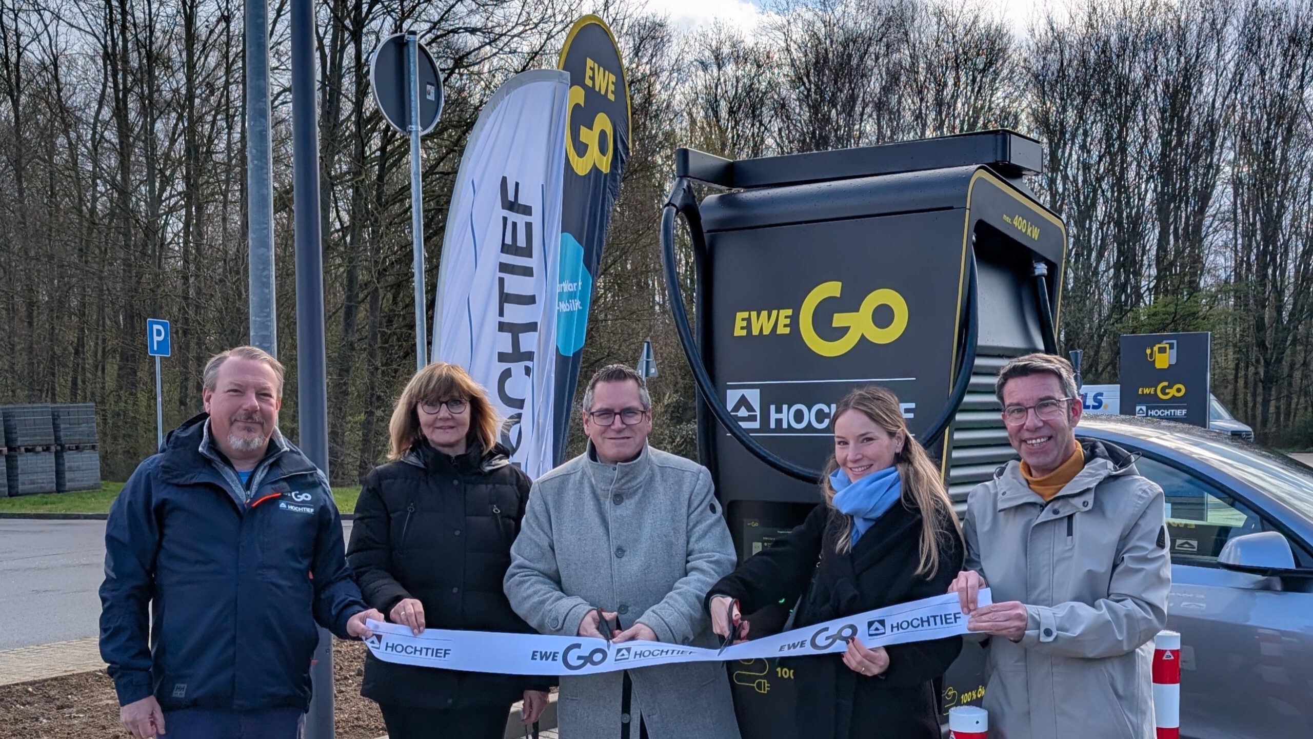 Bedburg, 16. März 2026. Gemeinsam mit Bürgermeister Sascha Solbach und weiteren Vertreterinnen und Vertretern der Stadt Bedburg haben EWE Go und HOCHTIEF auf dem Parkplatzgelände am Monte-Mare-Weg einen neuen Ladepark mit 8 Schnellladepunkten offiziell in Betrieb genommen. Jede Ladestation verfügt über eine Leistung von bis zu 400 kW. Je nach Fahrzeugtyp und Akkustand ist ein Ladevorgang damit in 15 bis 30 Minuten möglich. Alle Ladepunkte sind barrierearm gestaltet und werden mit 100 Prozent Ökostrom betrieben.