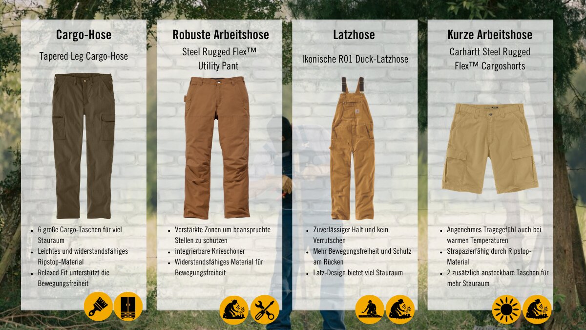 Carhartt steht seit Jahrzehnten für genau diese Verbindung aus Funktion, Langlebigkeit und Praxisnähe. Ursprünglich für den Arbeitsalltag auf der Baustelle entwickelt, finden die Produkte längst auch ihren Platz in Werkstätten, Gärten und Ateliers. Dabei folgt die Marke einem klaren Anspruch: „We serve and protect all hardworking people by building durable products“. Ein Ansatz, der sich nicht nur im professionellen Einsatz widerspiegelt, sondern überall dort, wo Menschen anpacken und ihre Projekte selbst umsetzen. Die Arbeitshose wird dabei zum zentralen Bestandteil jeder Ausstattung – abgestimmt auf das, was man vorhat.